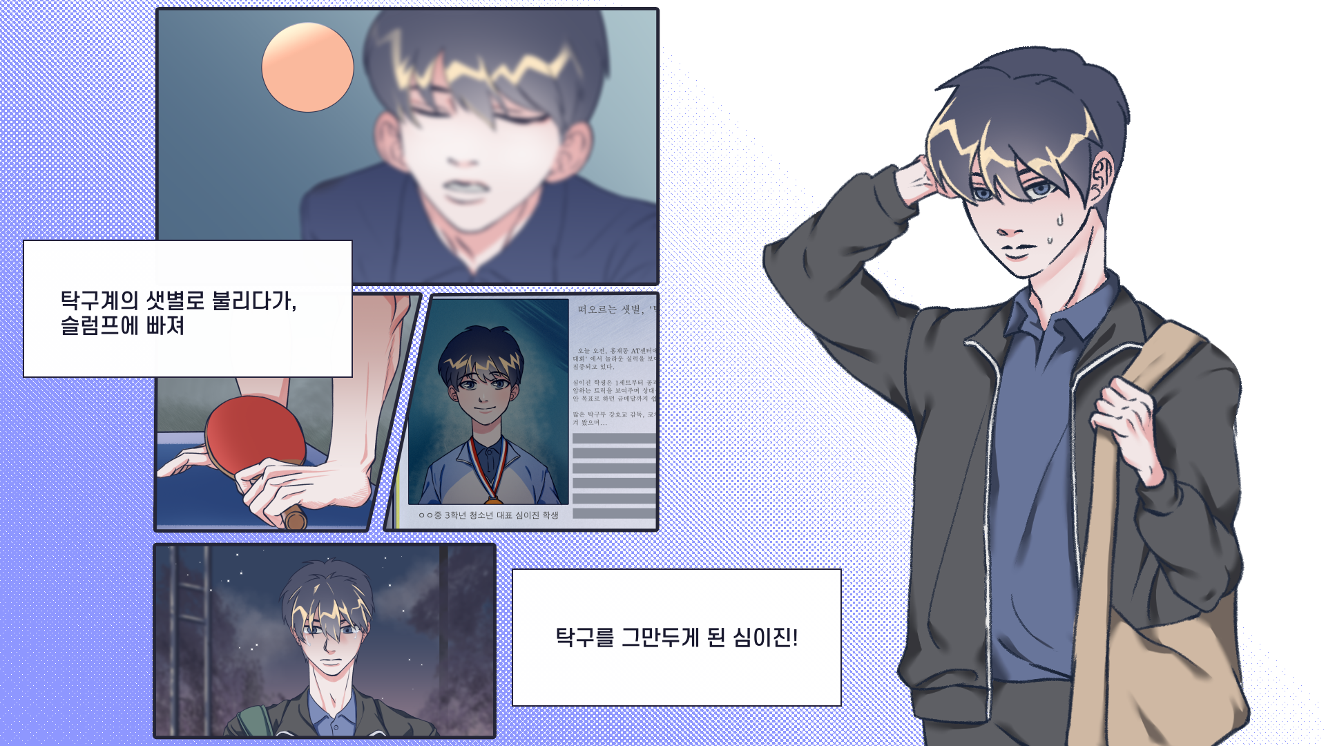 웹툰으로 각각 다른 등장인물이 가진 서사와 페르소나를 나의 방식으로 풀어내고 싶었다. 특히 탁구라는 스포츠를 보며 서로 랠리를 주고받으면서 무언의 대화를 하는 것 같다는 점이 매력적으로 다가왔다. 작중에서 탁구 유망주로 많은 관심을 받던 ‘심이진’이 슬럼프에 빠지며 탁구를 그만두겠다고 다짐했을 때, 갑자기 자기 앞에 나타나서 같이 탁구 국가대표에 도전하자고 설득하는 ‘강 준’을 만나며 두 인물이 각자 가지고 있던 서사, 페르소나를 어떻게 표현할지에 대해 고민하며 이 작품을 제작하게 되었다.