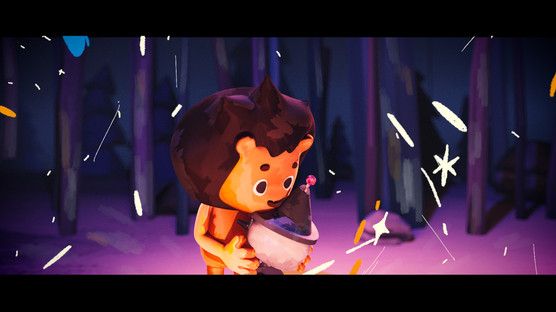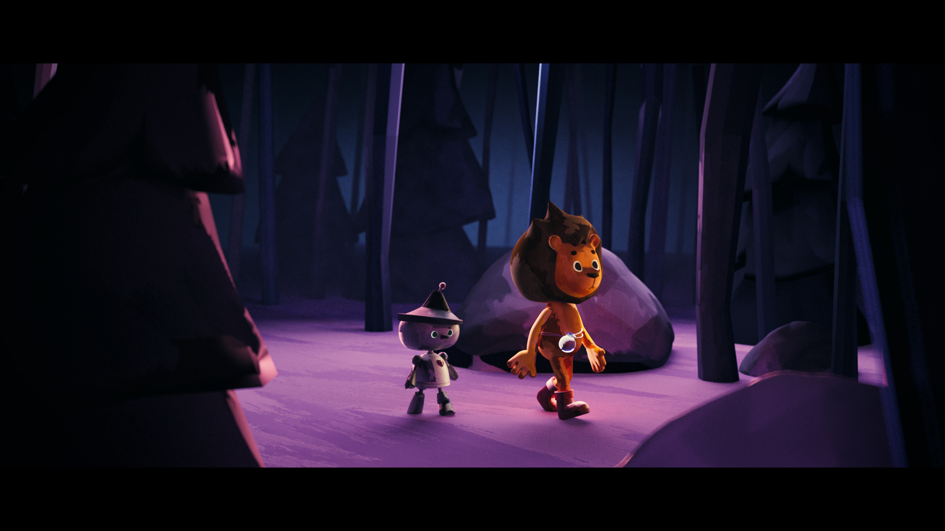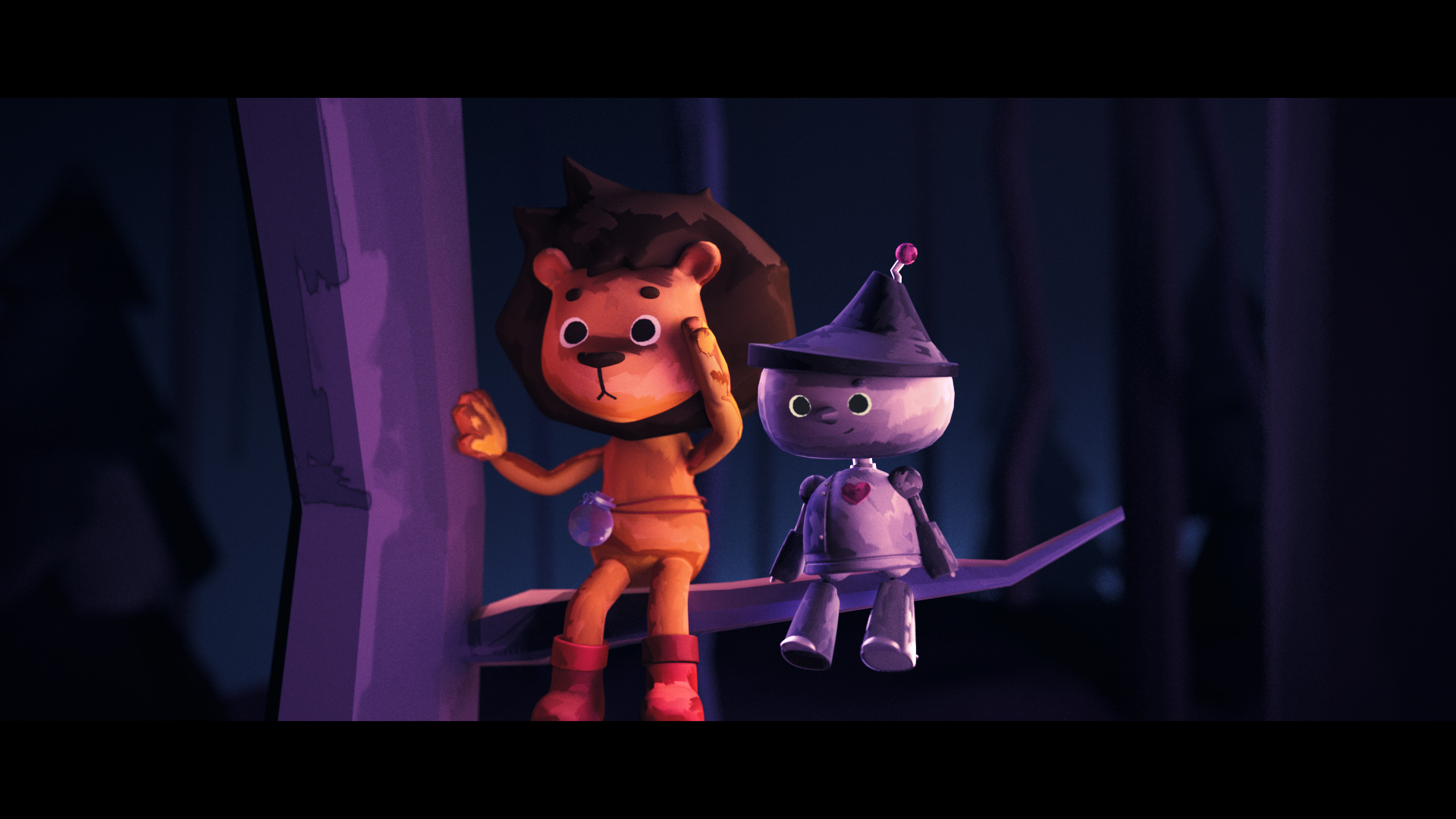 오즈의 마법사의 외전 이야기로 판타지 동화의 분위기를 극대화하고자 주인공과 전체적인 배경을 보라색 계열의 페인팅 질감을 살린 3D 기법으로 제작하였다. 배경과 달리 사자의 두려움을 상징하는 그림자와 용기를 나타내는 빛은 2D 프레임 바이 프레임 기법으로 제작하여 두려움과 용기에 집중할 수 있도록 표현하였다.